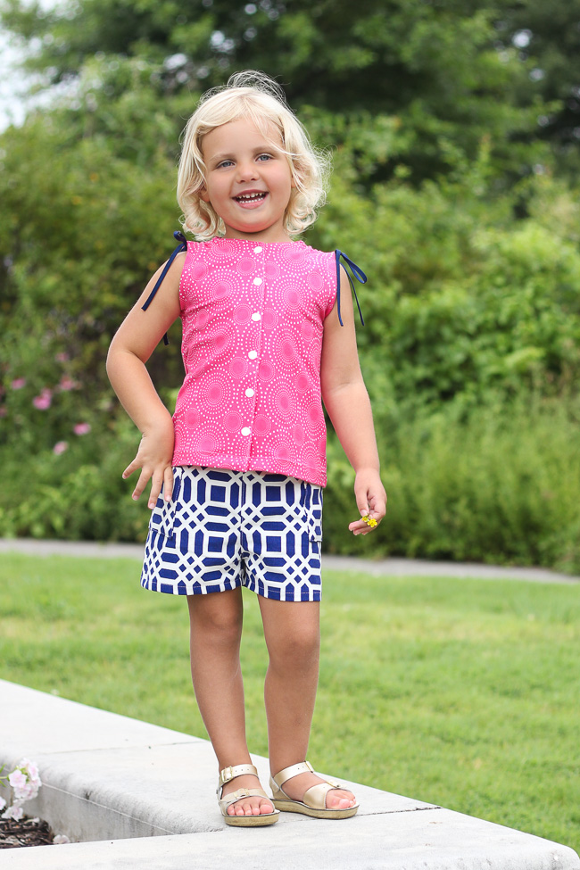 The body of the fabric yields a very clean pair of shorts that will stand up to lots of toddler play. I would also suggest Riley Blake home decor patterns for a Pleated Skirt and Sophie Pants.