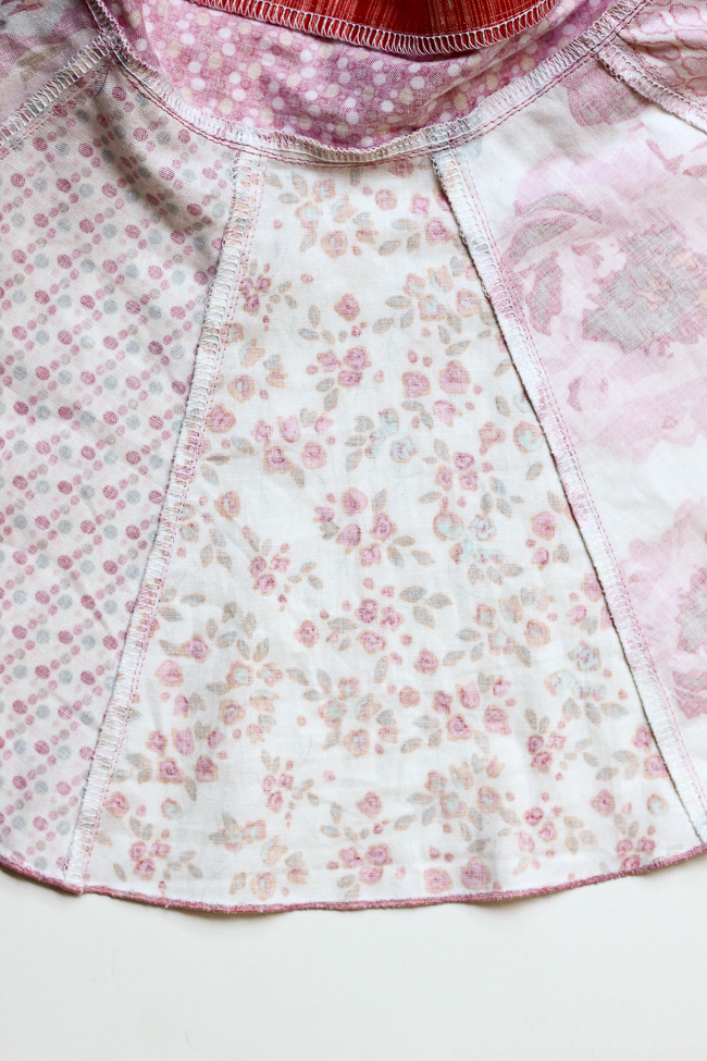 Now, create a tube with the skirt pieces. Sew the short sides right sides together with a 1/2" seam allowance and finish the seams. Hem the skirt at this point by folding the bottom edge to the wrong side 1/4". Then fold again 3/4". Stitch along the inner fold.