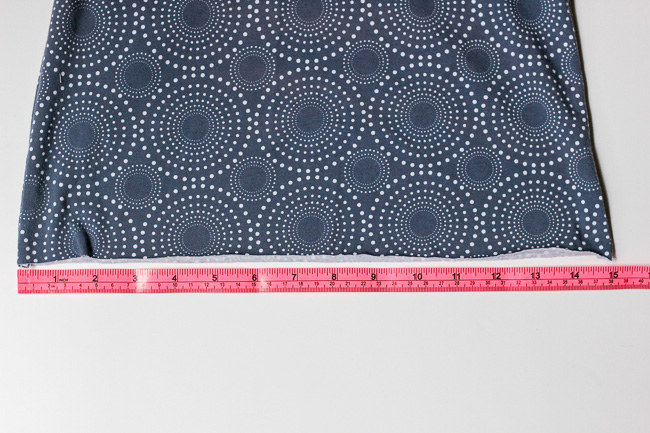 Cut all of your pattern pieces as indicated in the pattern except the waistband and pocket. Sew up the Breeann top per the pattern instructions omitting the pocket. Stop when you get to the waistband instructions. Measure the front and back of the bottom of your top from side seam to side seam. This was 15" for mine.